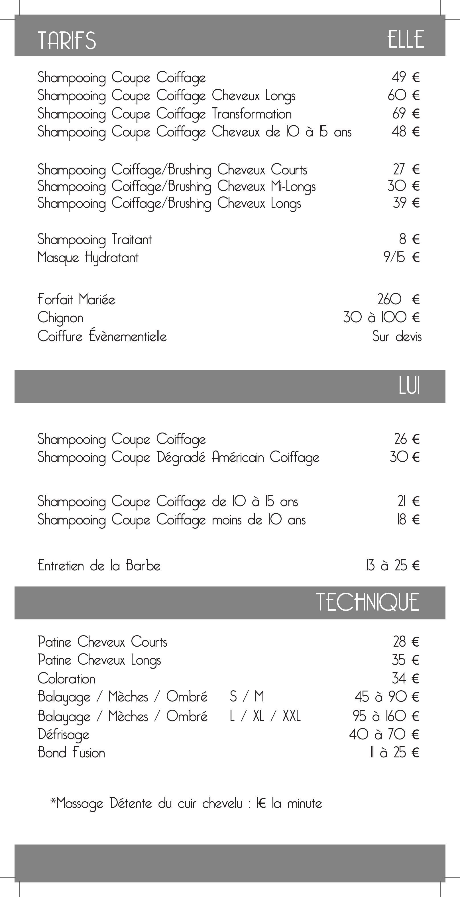 Voici les différents tarifs que nous appliquons dans notre salon de coiffure Mélina Création.